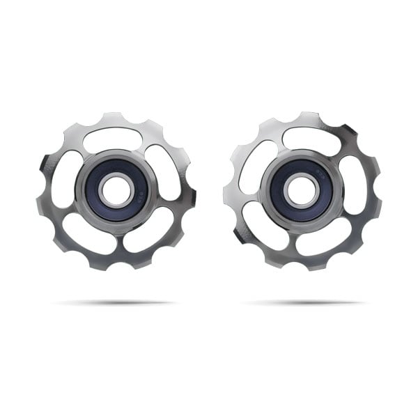 The pulleys spin 4-5 times faster than the crank (depending on gear ratio) and thus potentially add more friction than any other bearing found on your bicycle. Upgrading the pulleys is a must for any rider looking to save watts and reduce friction.